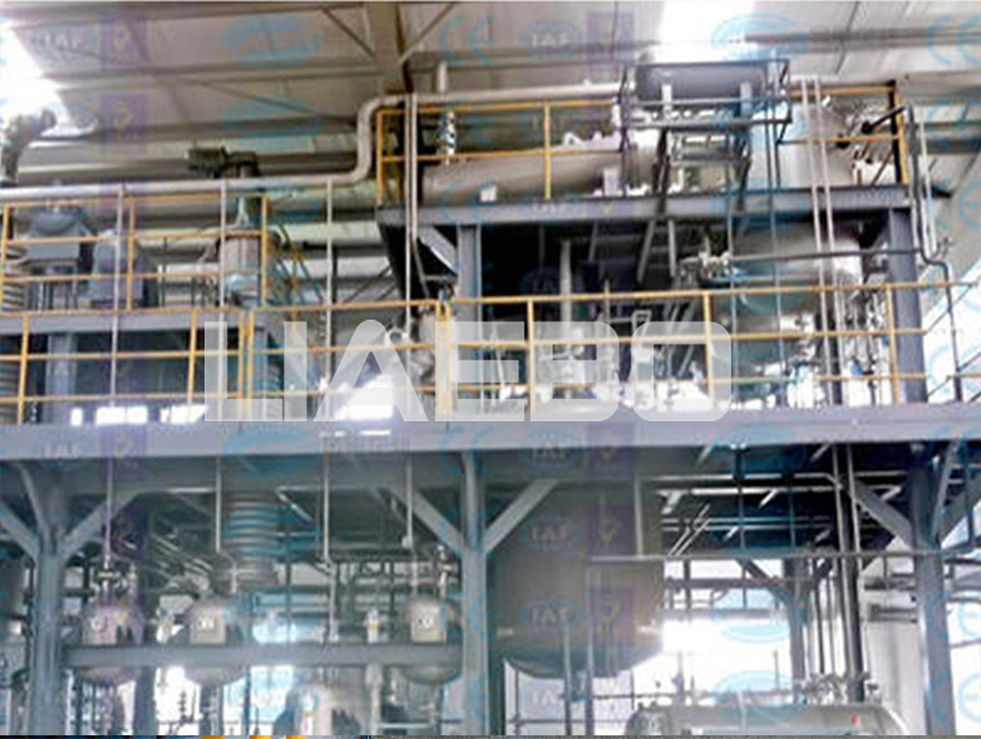 高位槽液體計量罐、生產(chǎn)平臺、地面真空上料、隔膜泵輸送回收廢水。